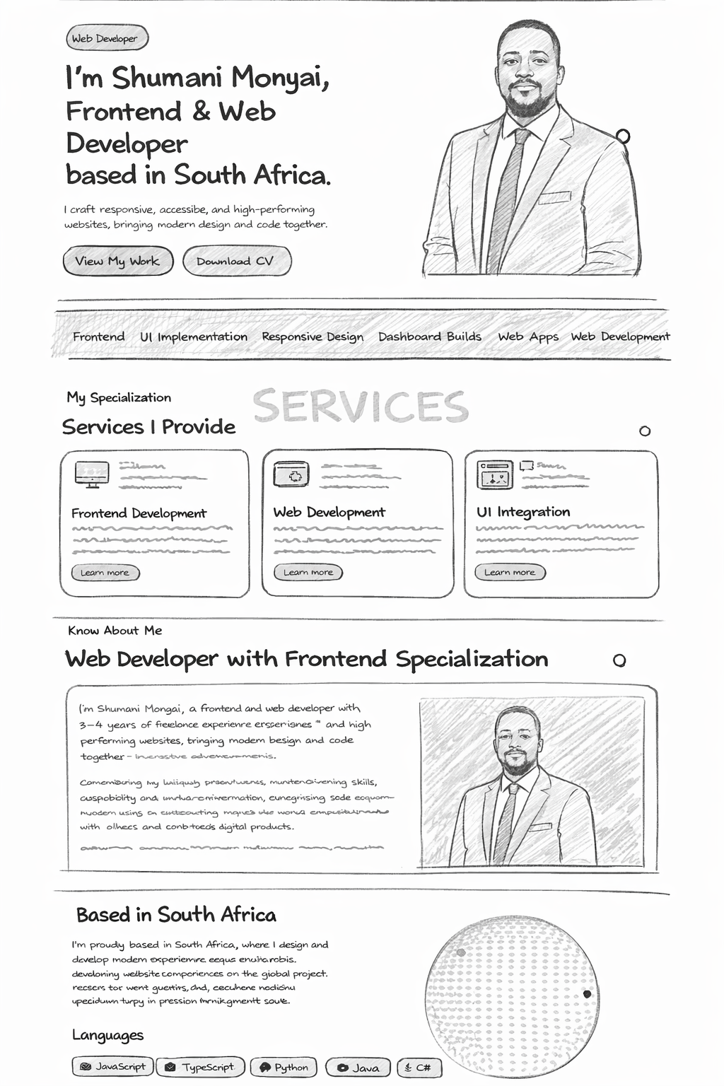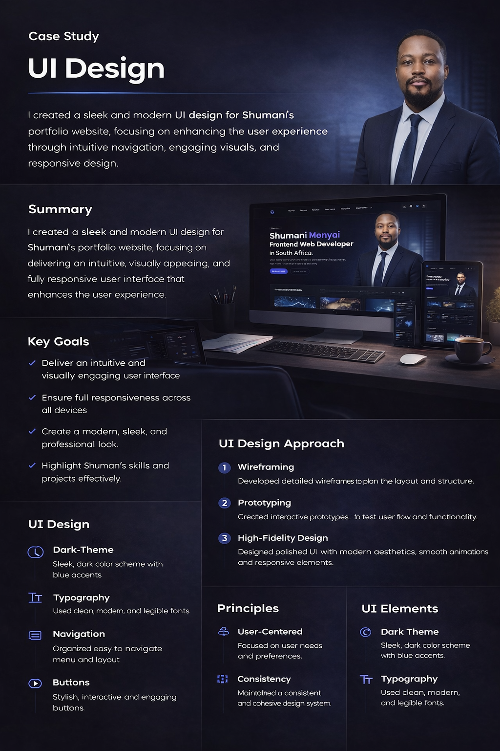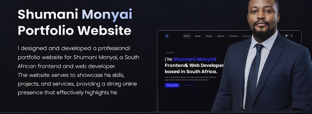 A complete design-to-development workflow for Shumani Monyai’s portfolio website, showcasing research, Figma wireframes, UI design decisions, and front-end implementation — built to production standards.